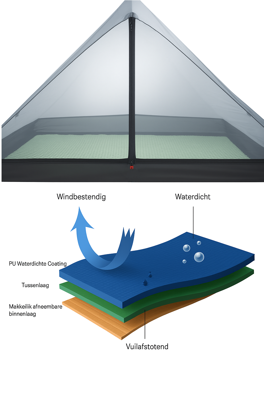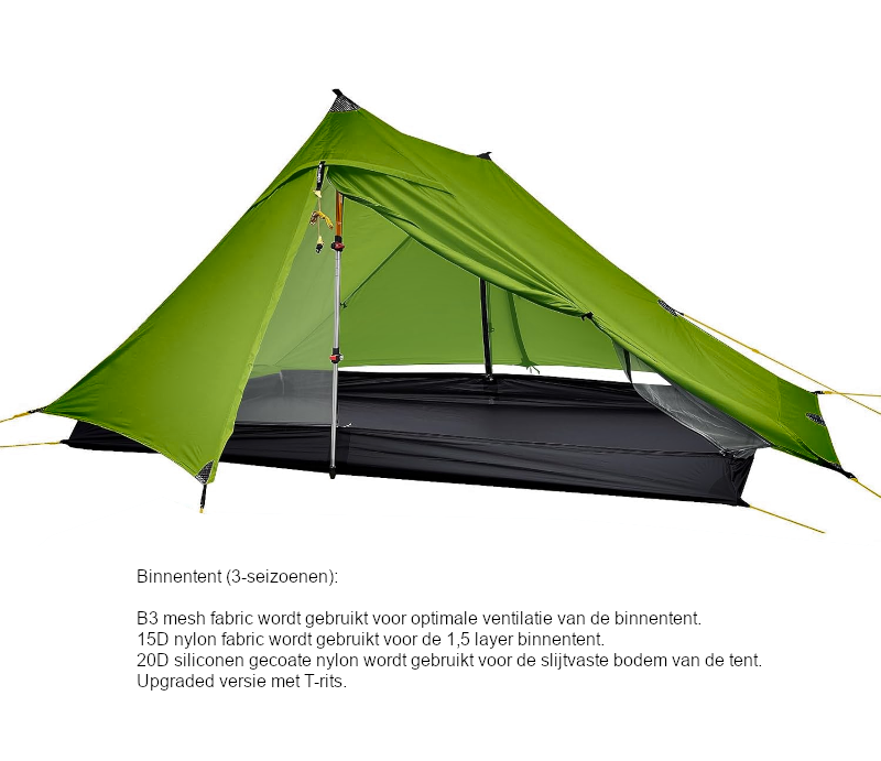 De 3-seizoenen binnentent is vervaardigd uit hoogwaardig B3 mesh gecombineerd met 15D nylon. Dit zorgt voor optimale ventilatie bij warm(er) weer! Daarmee is deze tent ideaal geschikt voor de lente, zomer en vroege herfst. Verder is dit de nieuwste versie, waarbij de binnentent is uitgerust met een handige T-ritssluiting voor eenvoudig in- en uitstappen.
