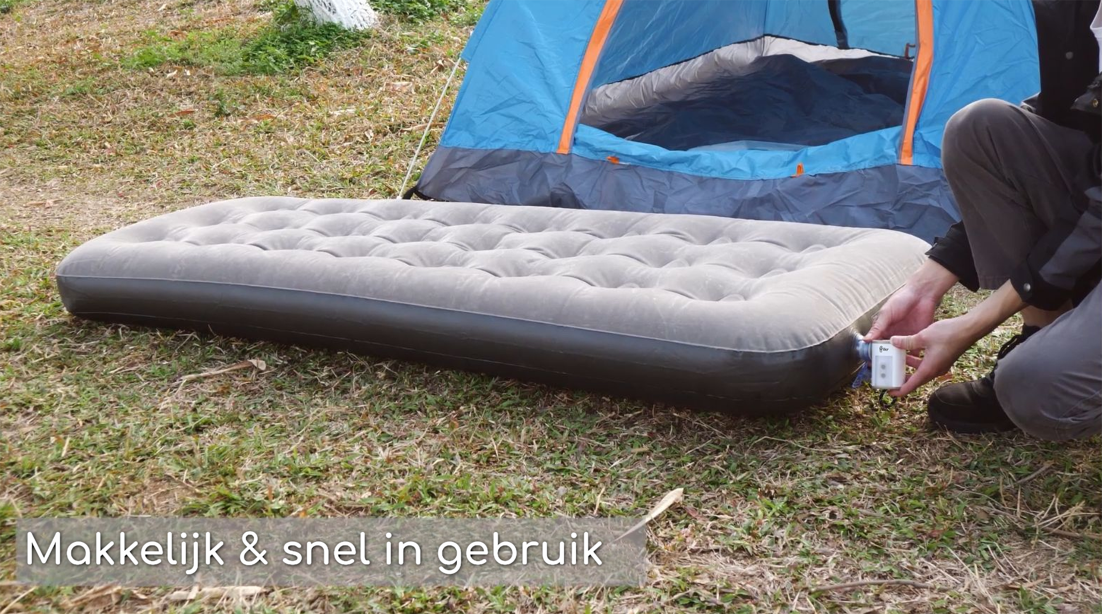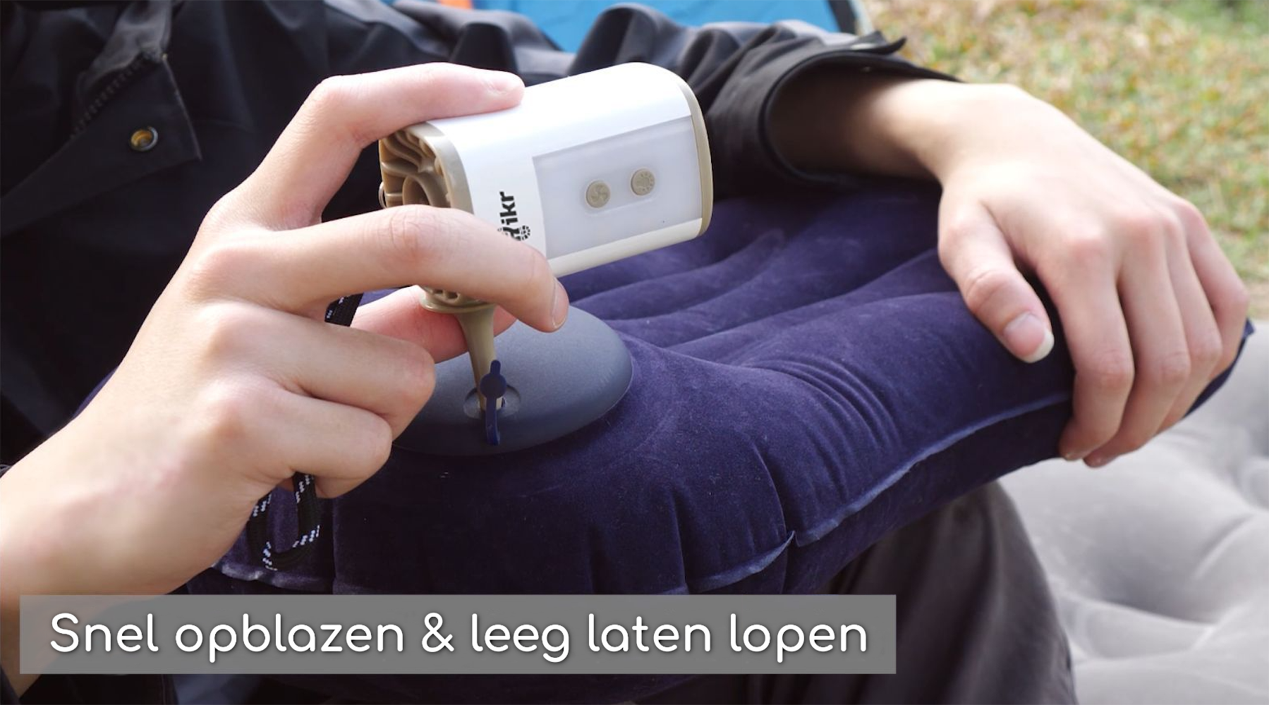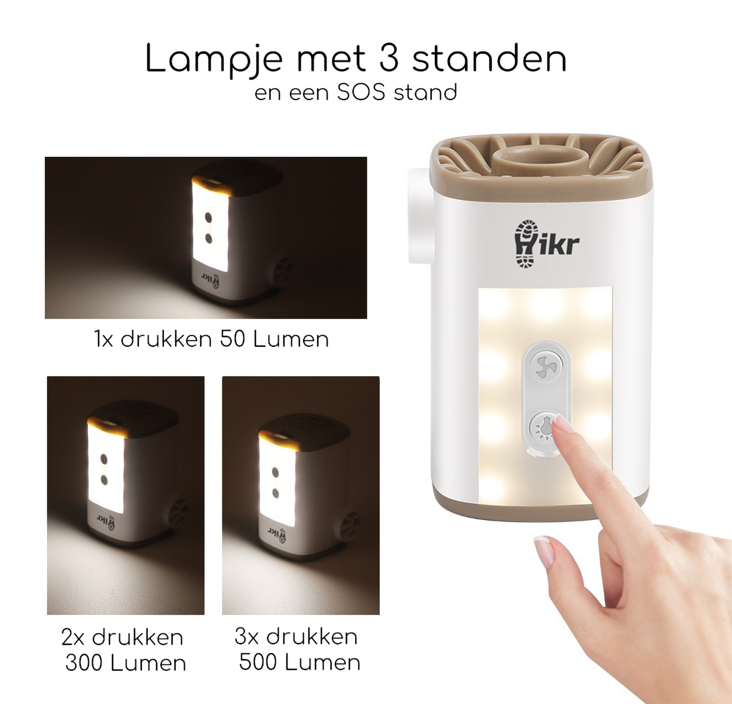 De Hikr luchtpomp wordt geleverd met maar liefst 4 verschillende opzetstukjes. Zodoende kan je de luchtpomp gebruiken voor het opblazen en versneld leeg laten lopen van de meest uiteenlopende opblaasartikelen. Denk bijvoorbeeld aan het supervlug opblazen van je luchtbed of luchtkussen! Met een PSI van 0,7 en een 3600mAh batterij ben je verzekerd van voldoende druk en een zeer lange levensduur (tot 83 minuten)! Met een volle batterij kan je maar liefst 40 luchtbedden opblazen! Middels het bijgeleverde USB (Type-C) kabeltje kan je de Hikr luchtpomp gemakkelijk weer opladen. Verder kent de Hikr automatische luchtpomp maar liefst 4 verschillende functies. Zo kan je deze opblaaspomp gebruiken voor opblazen & versneld leeg laten lopen, als powerbank voor het supersnel opladen van je mobiel en als kampeerlampje. Kortom een zeer handige en lichtgewicht (slechts ~150 gram) automatische opblaaspomp die je gemakkelijk meeneemt bij al jouw outdoor avonturen!