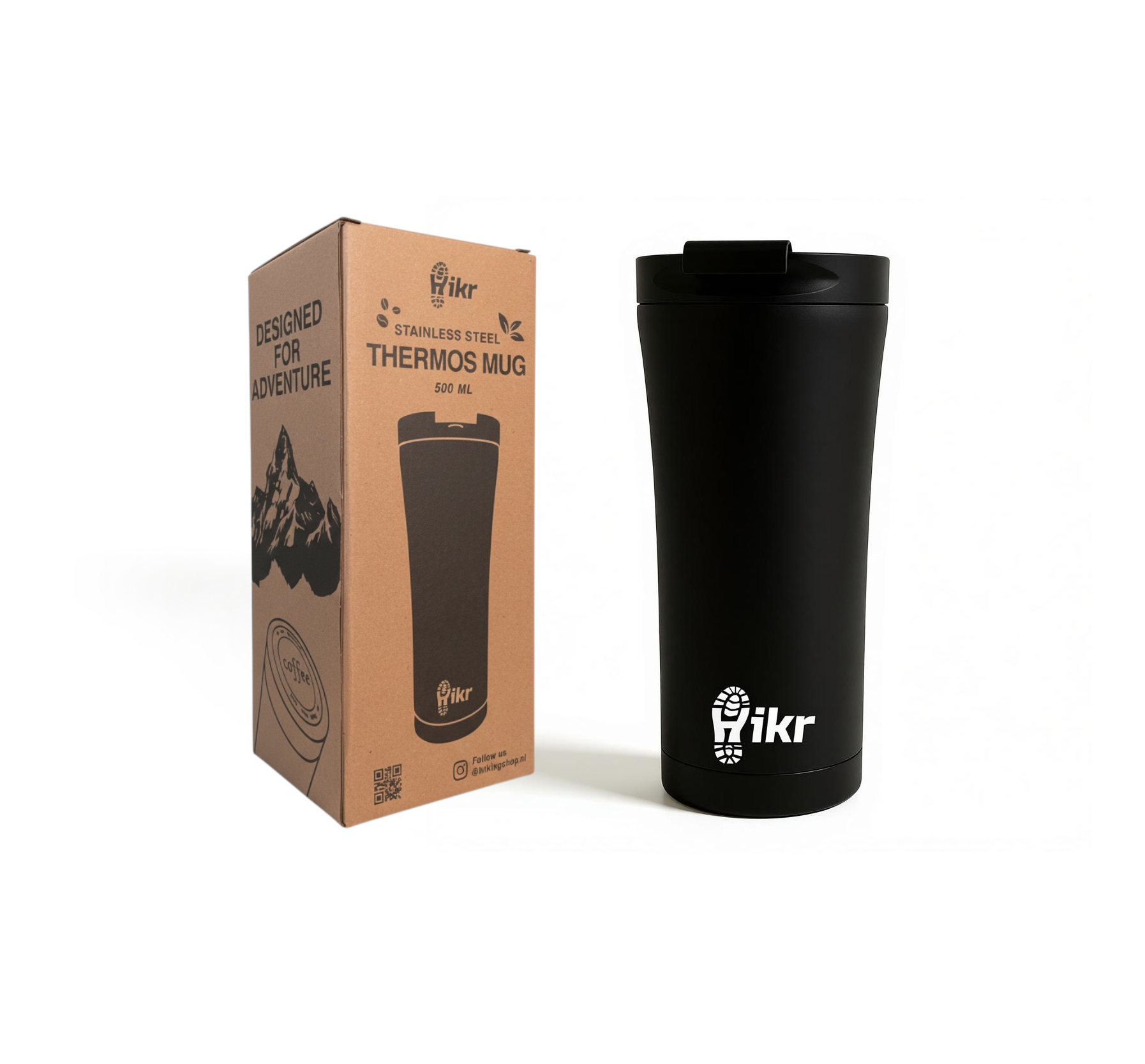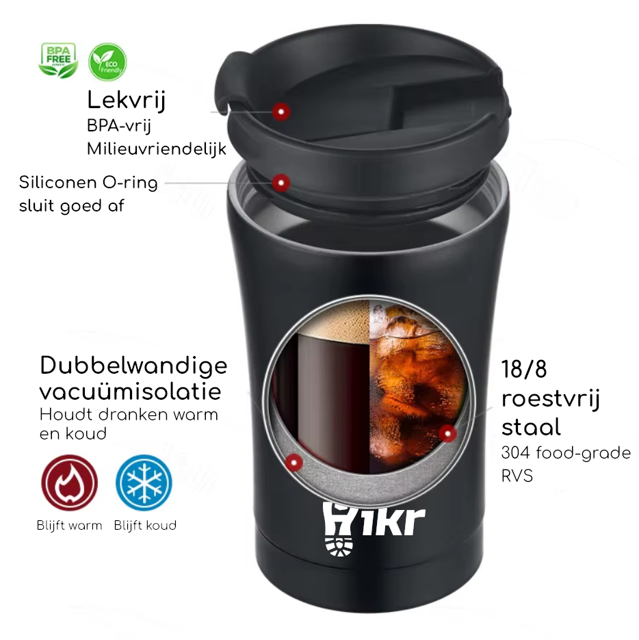 De Hikr koffiebeker combineert een strak ontwerp met duurzame materialen. De dubbelwandige vacuümisolatie van 18/8 roestvrij staal zorgt ervoor dat warme dranken aangenaam warm blijven en koude dranken langdurig fris blijven. De stevige klikdop sluit volledig af en is met één hand te openen, waardoor je hem veilig gebruikt tijdens wandelen, fietsen of autorijden.