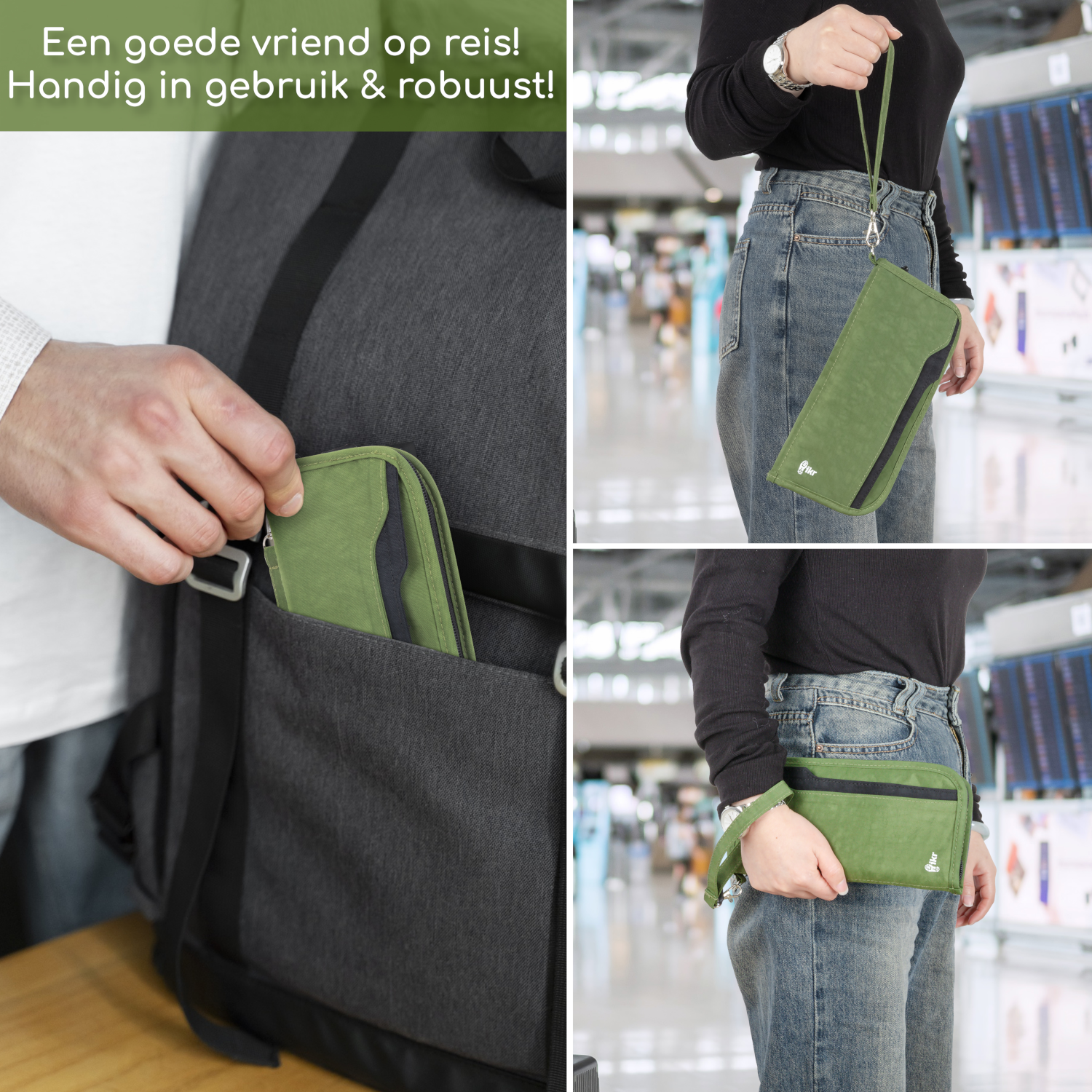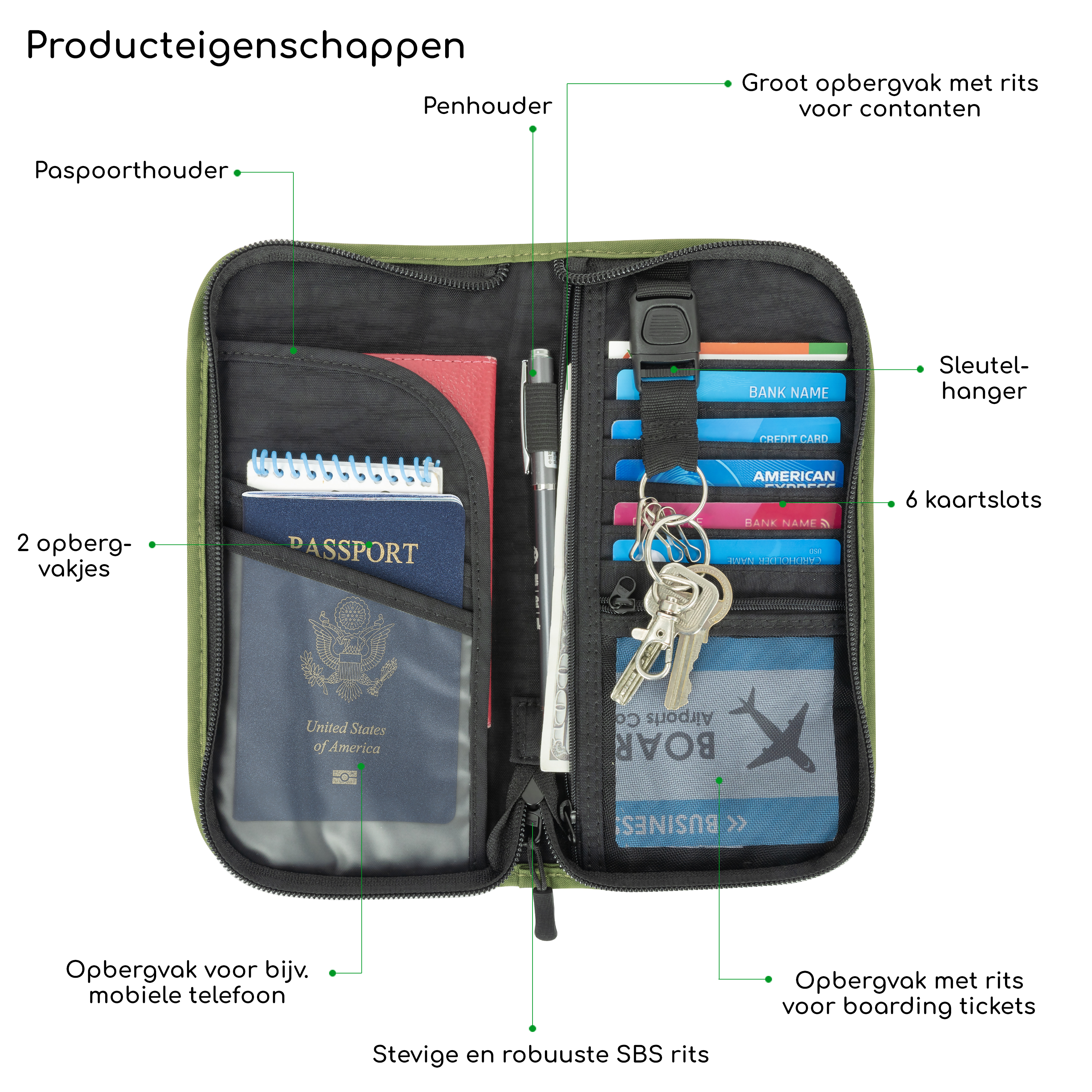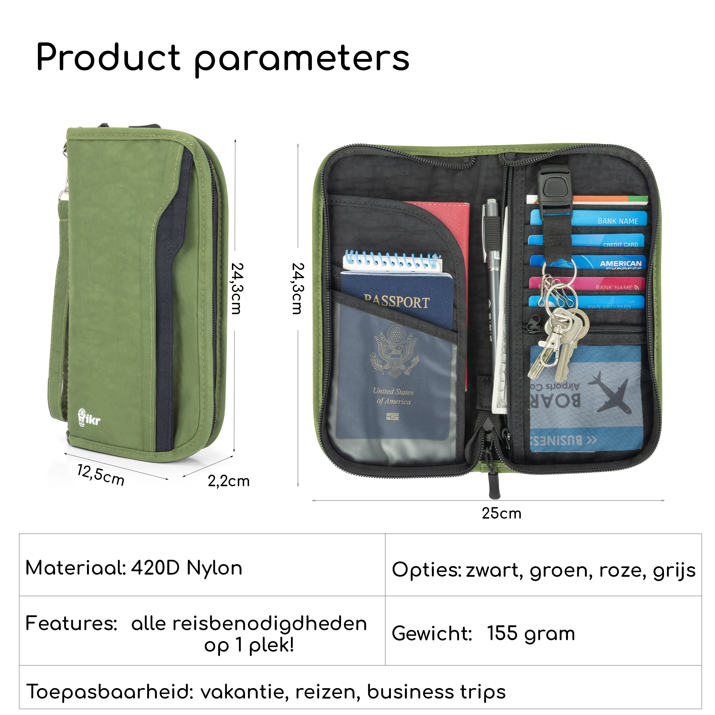 De reisportemonnee van Hikr is vervaardigd uit hoogwaardige 420D Nylon fabric. Dit garandeert een slijtvaste reisportemonnee die tegen een stootje kan. Verder is deze reisportemonnee waterdicht en 100% RFID-werend (tegen skimmen!). Hiermee ben je verzekerd van optimale bescherming van jouw kostbaarheden gedurende verschillende (weers)omstandigheden! Daarnaast is deze reisportemonnee zeer compleet en met een totale afmeting van 24,3cm x 25cm (uitgeklapt) biedt het tal van opbergmogelijkheden. Zo heb je alle reisdocumenten altijd goed geordend en kan je ze gemakkelijk terugvinden! Het compacte pakformaat van 24,3cm x 12,5cm x 2,2cm zorgt er tevens voor dat je deze reisportemonnee eenvoudig met je meedraagt. Kortom een must-have voor iedere reiziger die zorgeloos op reis wilt gaan!