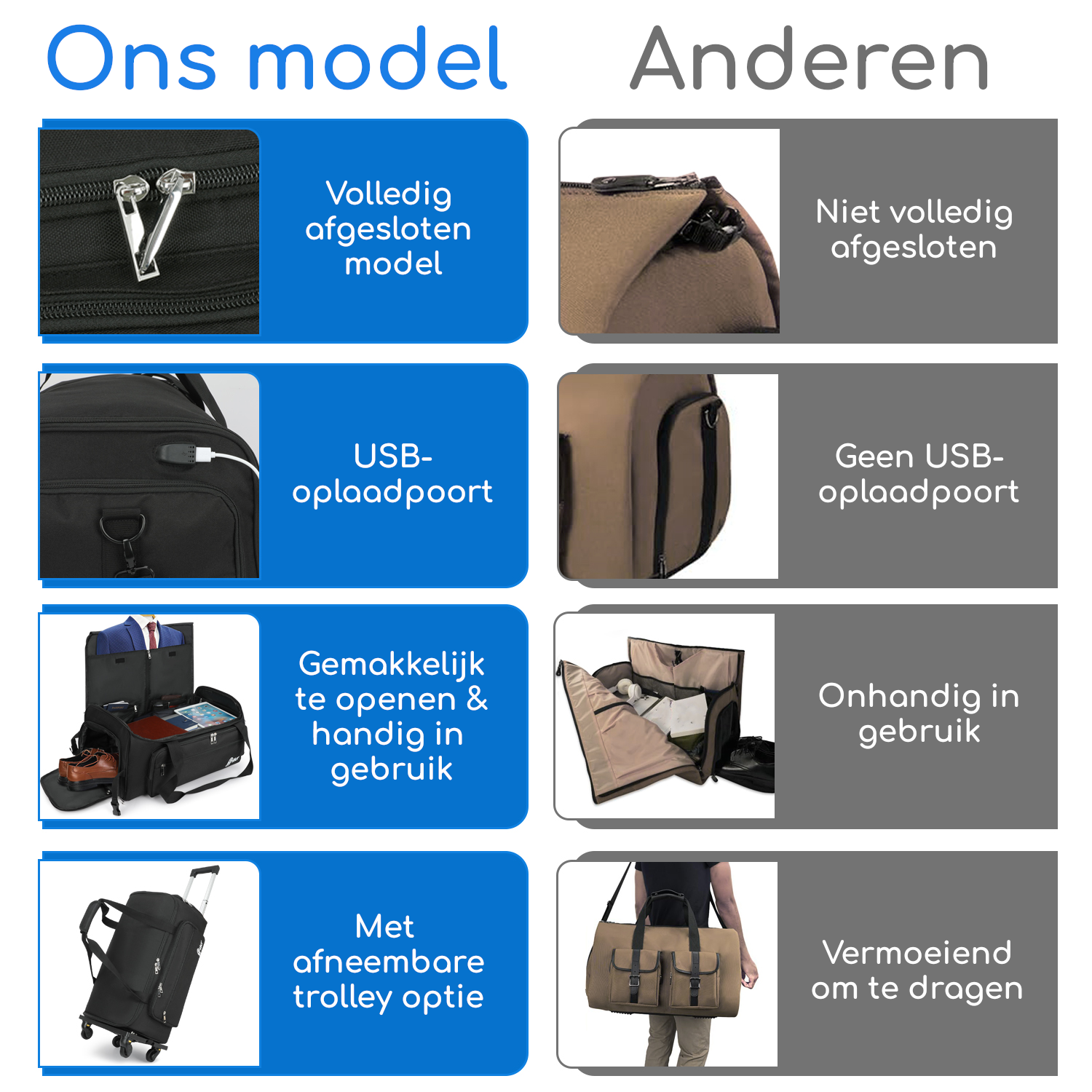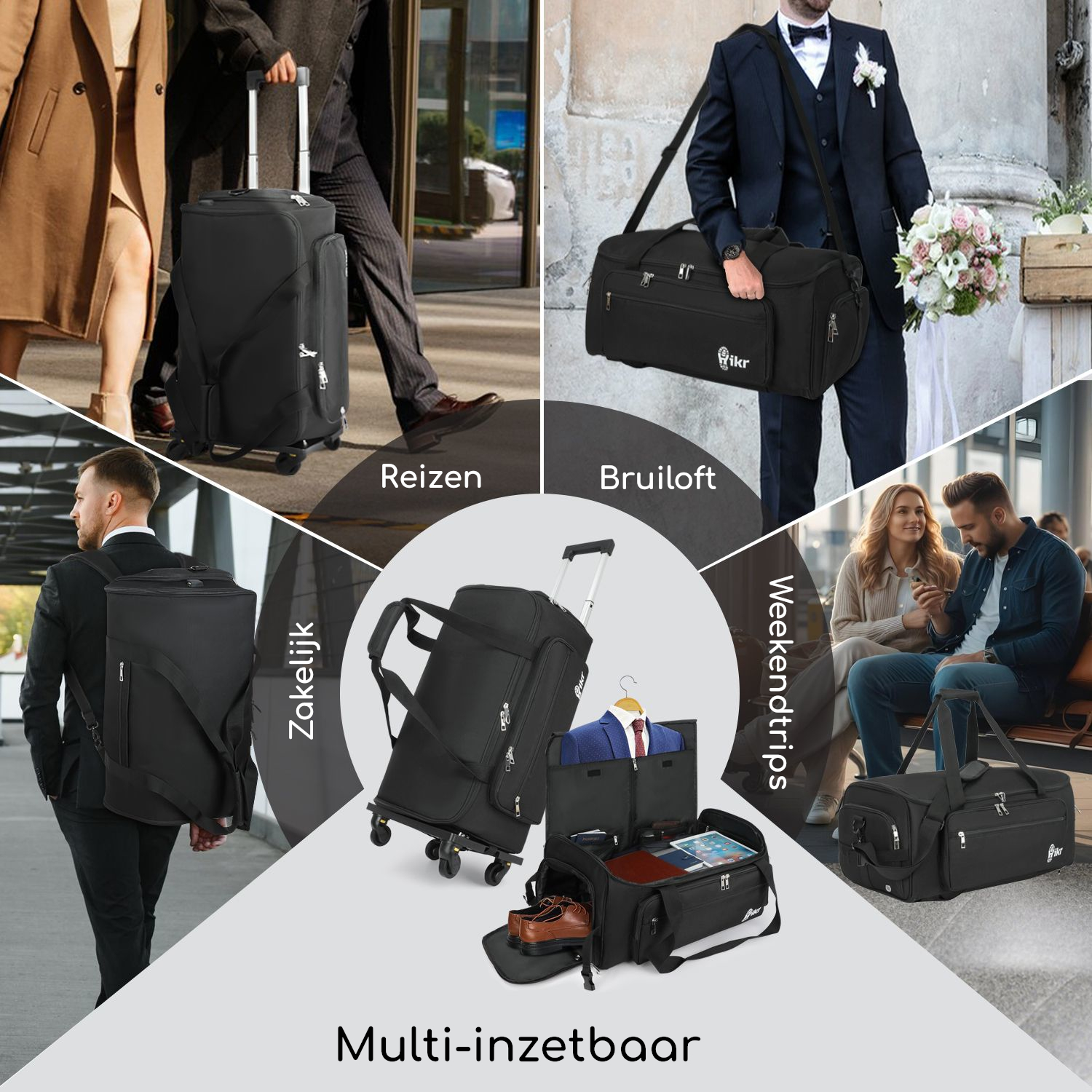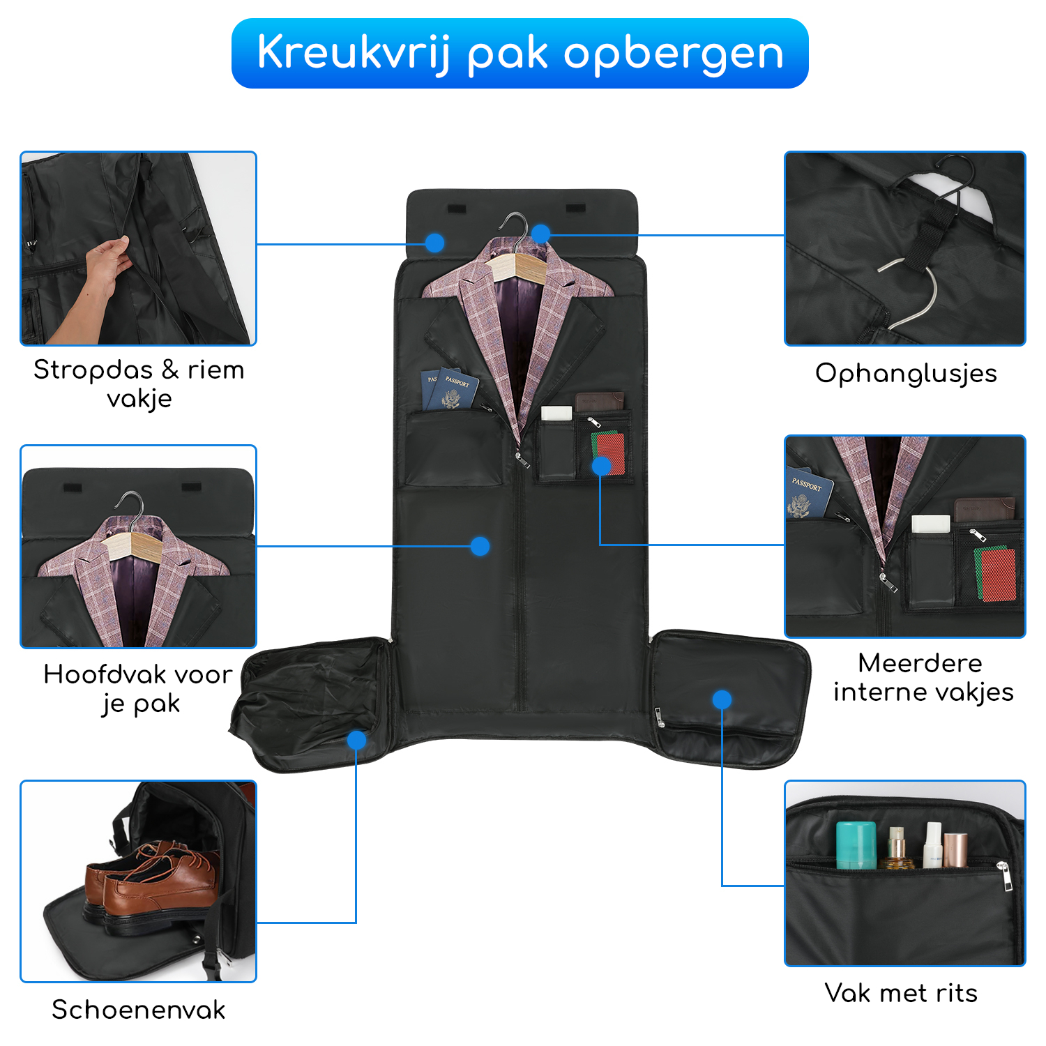 De tas biedt slimme compartimenten voor je pak, schoenen en andere accessoires zoals een stropdas, pennen en opladers. Alles heeft zijn plek, zodat je georganiseerd en stressvrij op reis kunt.