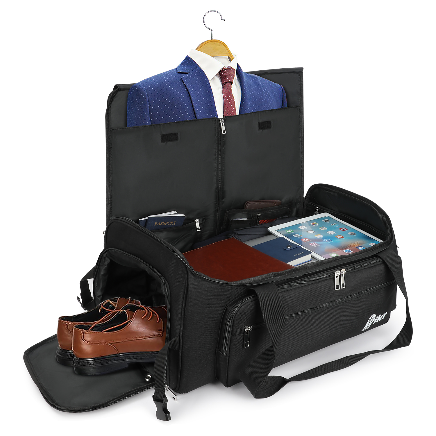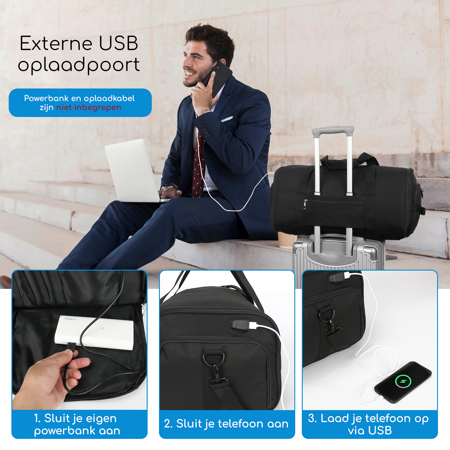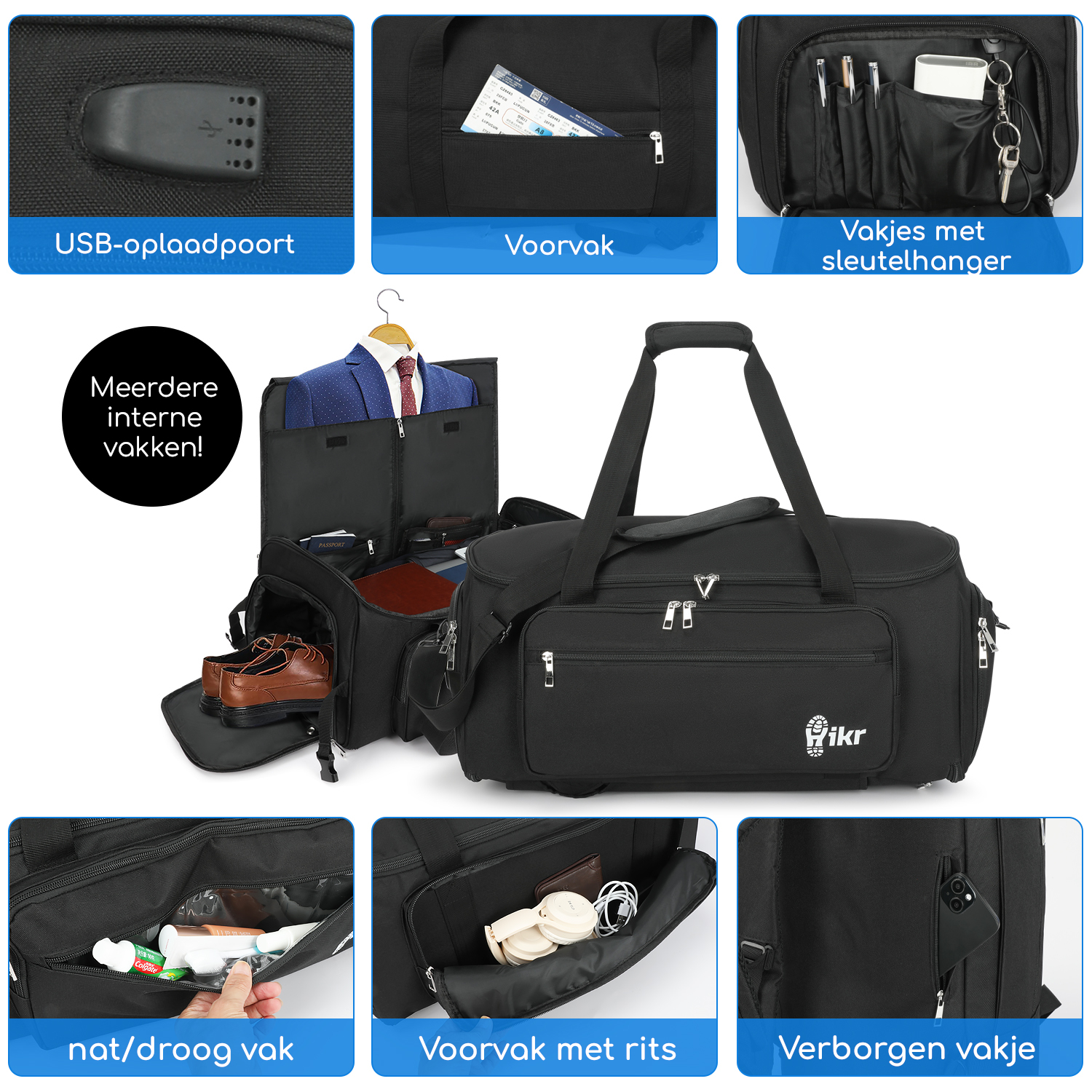 De tas biedt slimme compartimenten voor je pak, schoenen en andere accessoires zoals een stropdas, pennen en opladers. Alles heeft zijn plek, zodat je georganiseerd en stressvrij op reis kunt.